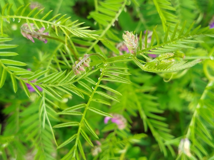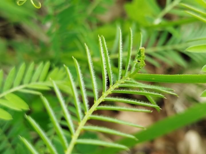 Стабло биљке је танко и угласто, висине од 50 до 150 cm. Стабло може бити полегло или се пење уз друге биљке. Често по себи има не толико изражене длачице. Листови су сложени. На једној дршци је од 12 до 30 малих, уских листића распорећених у паровима, један наспрам другог. Мекани су и у облику издужене елипсе. На врху држке налази се неколико танких, кончастих „бркова“ – рашљика које се увијају. Они јој служе да се ухвати за суседну биљку и пење уз њу тражећи сунчеву светлост и топлоту.